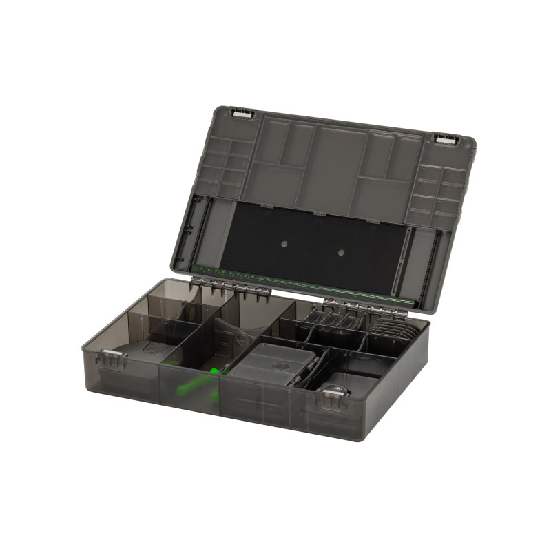 Les parois permanentes de la Tackle Box sont parfaitement espacées pour accueillir vos bobines de terminaux, boîtes d'accessoires, Bait floss, Leadcore, Arma Kord, Leader Safes, boîtes Kamakura pour hameçons, ainsi que d’autres articles comme des ciseaux et des aiguilles.