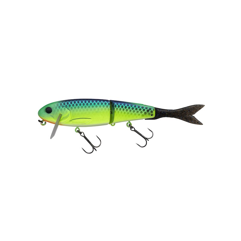 Le Blast Bone 190 SF revisite le légendaire Flat Bone Clicker. Ce «Jointed Big Bait» de premier choix en reprend les spécificités (leurre flottant équipé d'une bavette inclinée de manière à le faire évoluer juste sous la surface à la récupération, corps à flancs plats segmenté en deux parties dont le mouvement va créer le cliquetis si caractéristique de l'ancienne version) à l'exception d'une queue en élastomère de type poisson. Cette nouvelle forme de queue autorise un déplacement d'eau plus important sur les récupérations en linéaire et sera nettement plus réactive sur les phases de pause lorsqu'il s'agira de décider des carnassiers récalcitrants grâce à des animations fines exercées par des tremblements de la ligne. Le Blast Bone a la faculté de réaliser facilement un «Walking the Dog» sans trop s'éloigner de sa position initiale le pré destinant à l'origine à des pêches de postes marqués (aux abords des cavités de berges et dans les couloirs d'herbiers, les zones de couverts, les bois immergés, les enrochements et tout autre type de structure). Du fait de son fort 'Rolling' et sa capacité à déplacer un gros volume d'eau sur les récupérations linéaires continues, les pêcheurs européens de brochet et de black-bass spécimens s'approprieront rapidement ce leurre pour toutes les pêches de prospection quelle que soit la taille du milieu. Nous vous conseillons l'ajout d'un lest de type de 'John Weight' afin de modifier sa densité, pour le rendre au choix 'Suspending', coulant lent ou coulant plus rapide permettant de rendre le Blast Bone toujours plus polyvalent. Laissez-vous séduire par cette bombe à retardement !